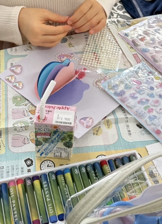 シールやパーツを使って装飾したり、ページをめくれるお手紙のようにしたり、穴あけパンチで形を作ったりと、集中して取り組む姿がとても印象的でした。